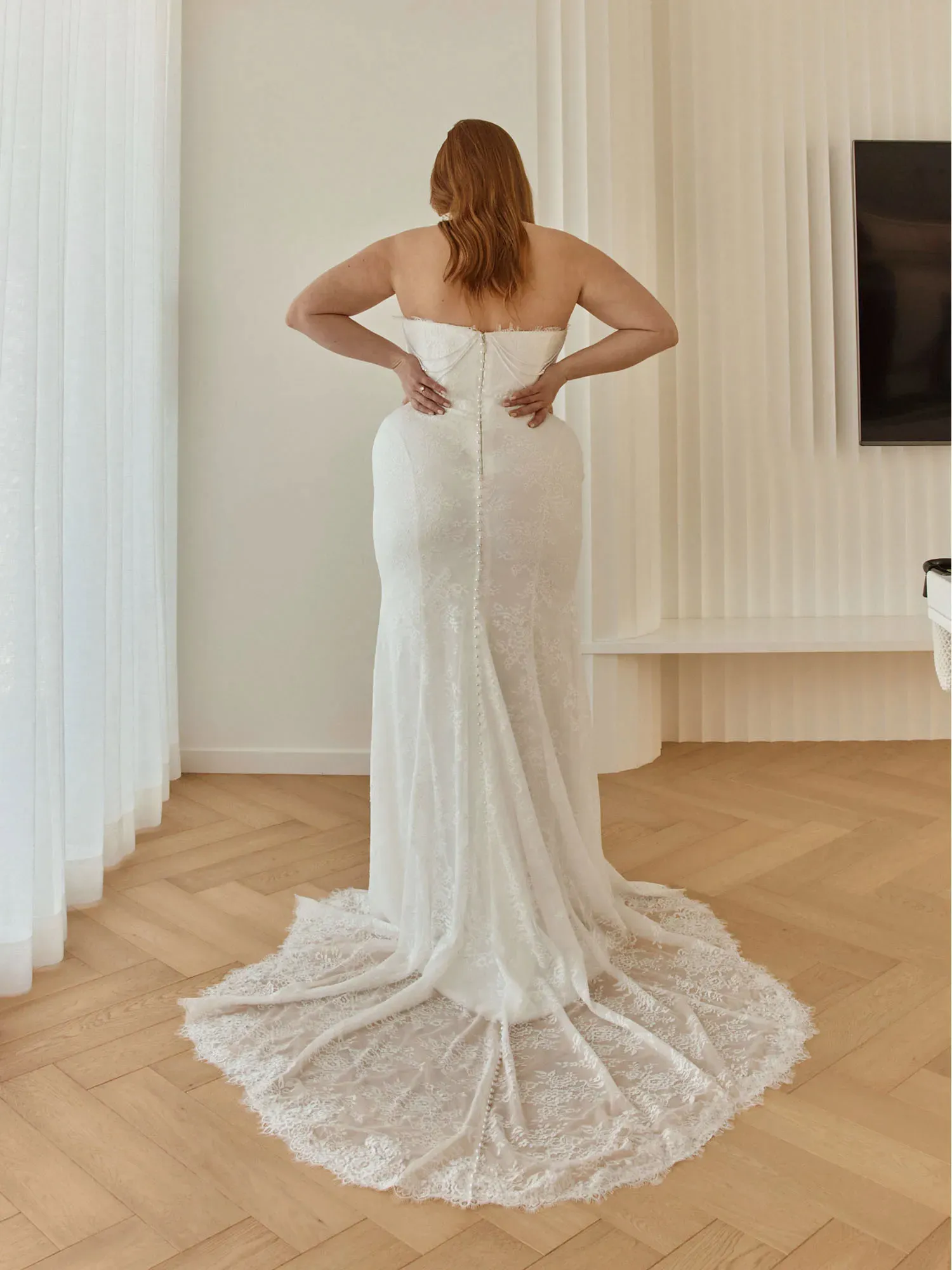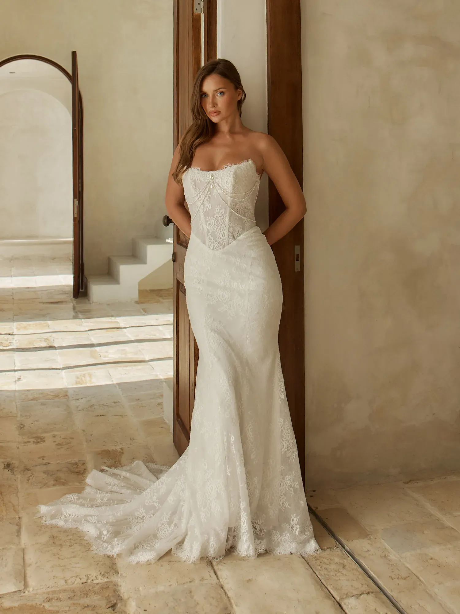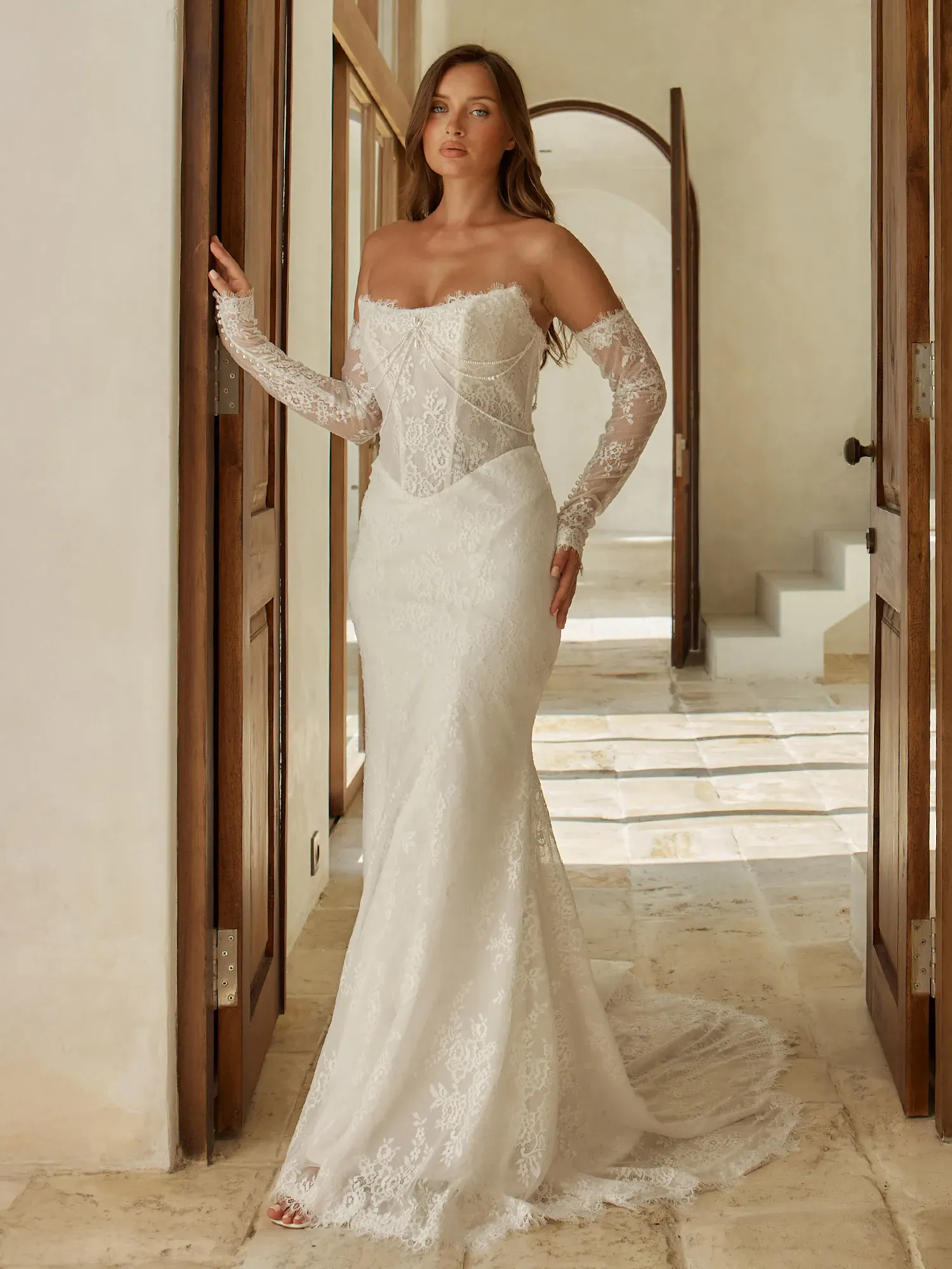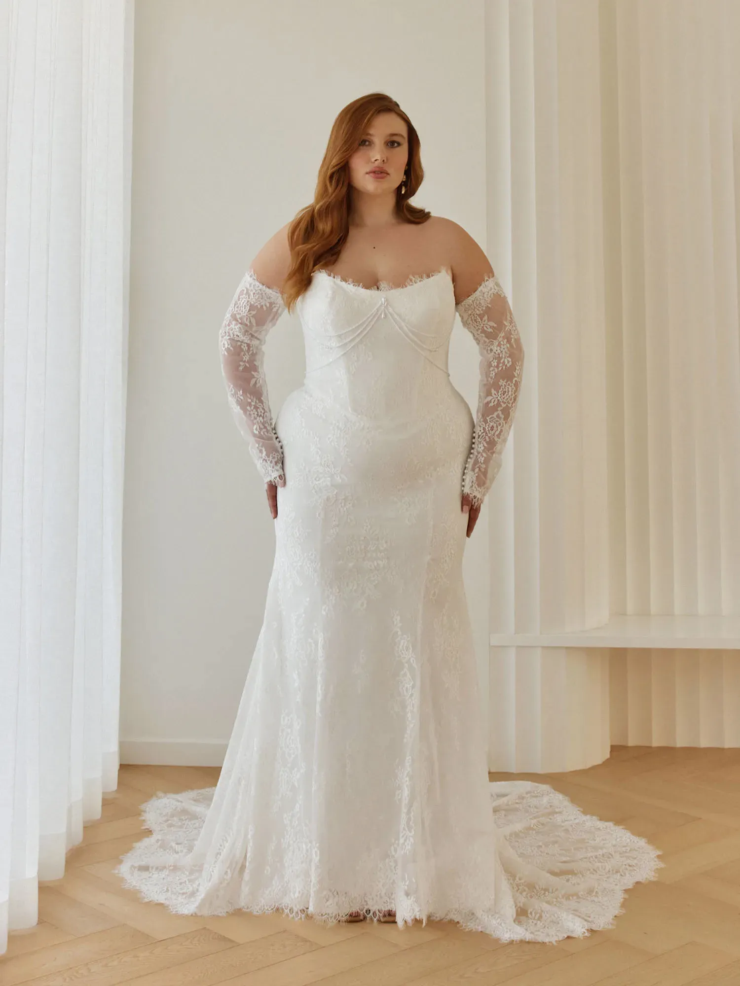 Sleek, detailed, and beautifully refined, Chessy by Serene Bridal is designed for the bride who loves fashion-forward lace with sculpted, modern shaping. Blending vintage-inspired accents with a clean silhouette, she delivers statement-making sophistication.