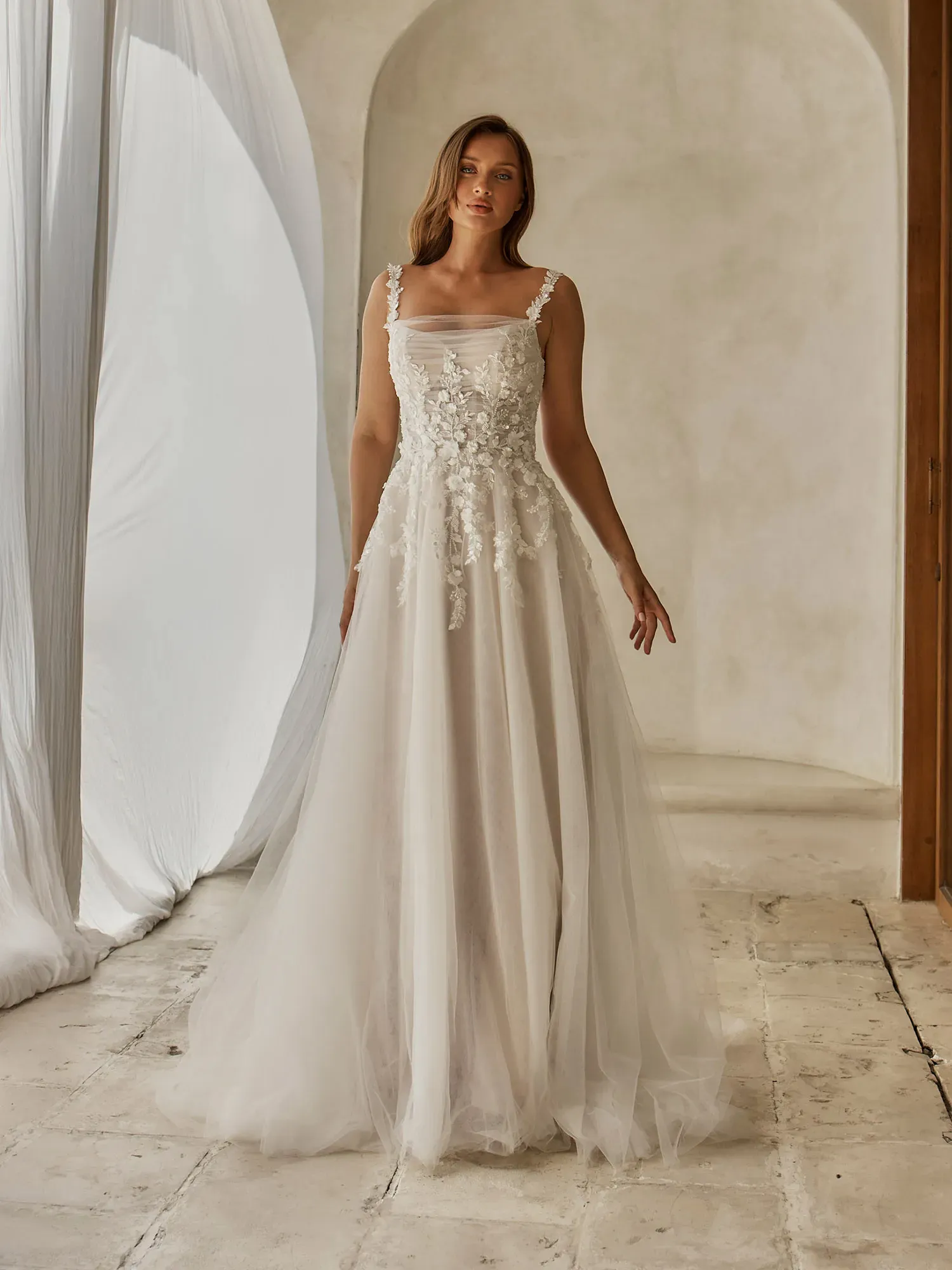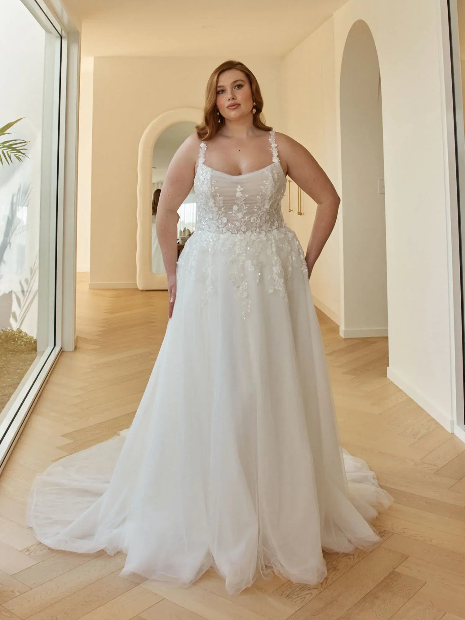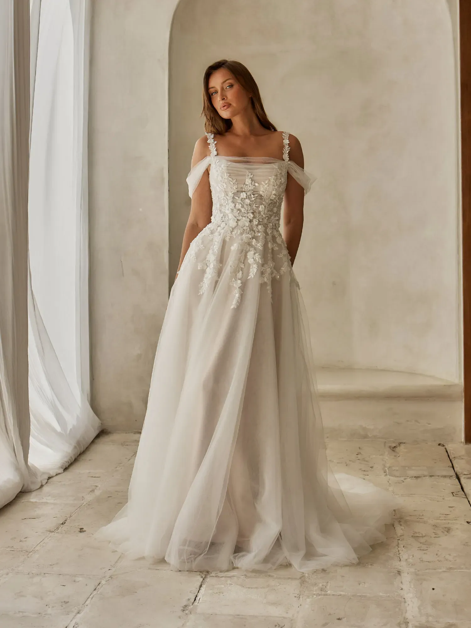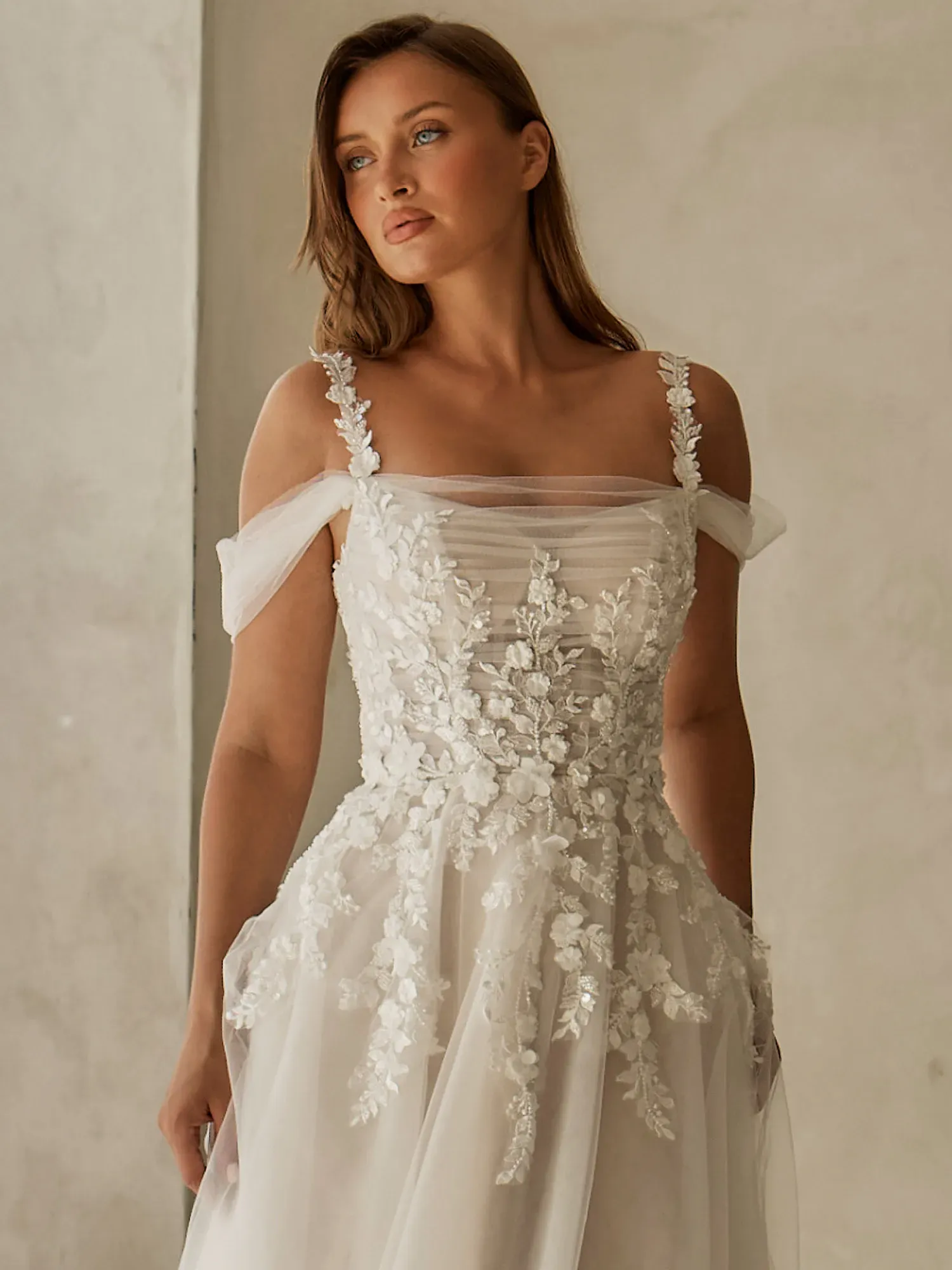 Soft, romantic, and delicately detailed, Kelly by Serene Bridal is designed for the bride who loves airy, ethereal elegance with gentle structure and a subtle shimmer. Layered tulle and floral texture create a graceful, dreamlike silhouette.