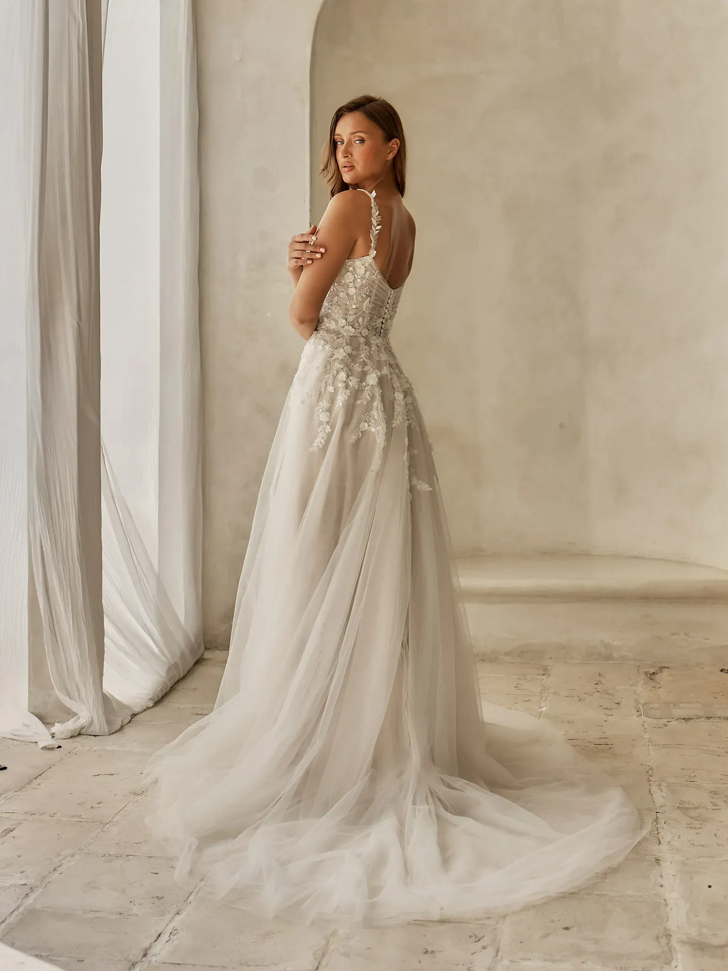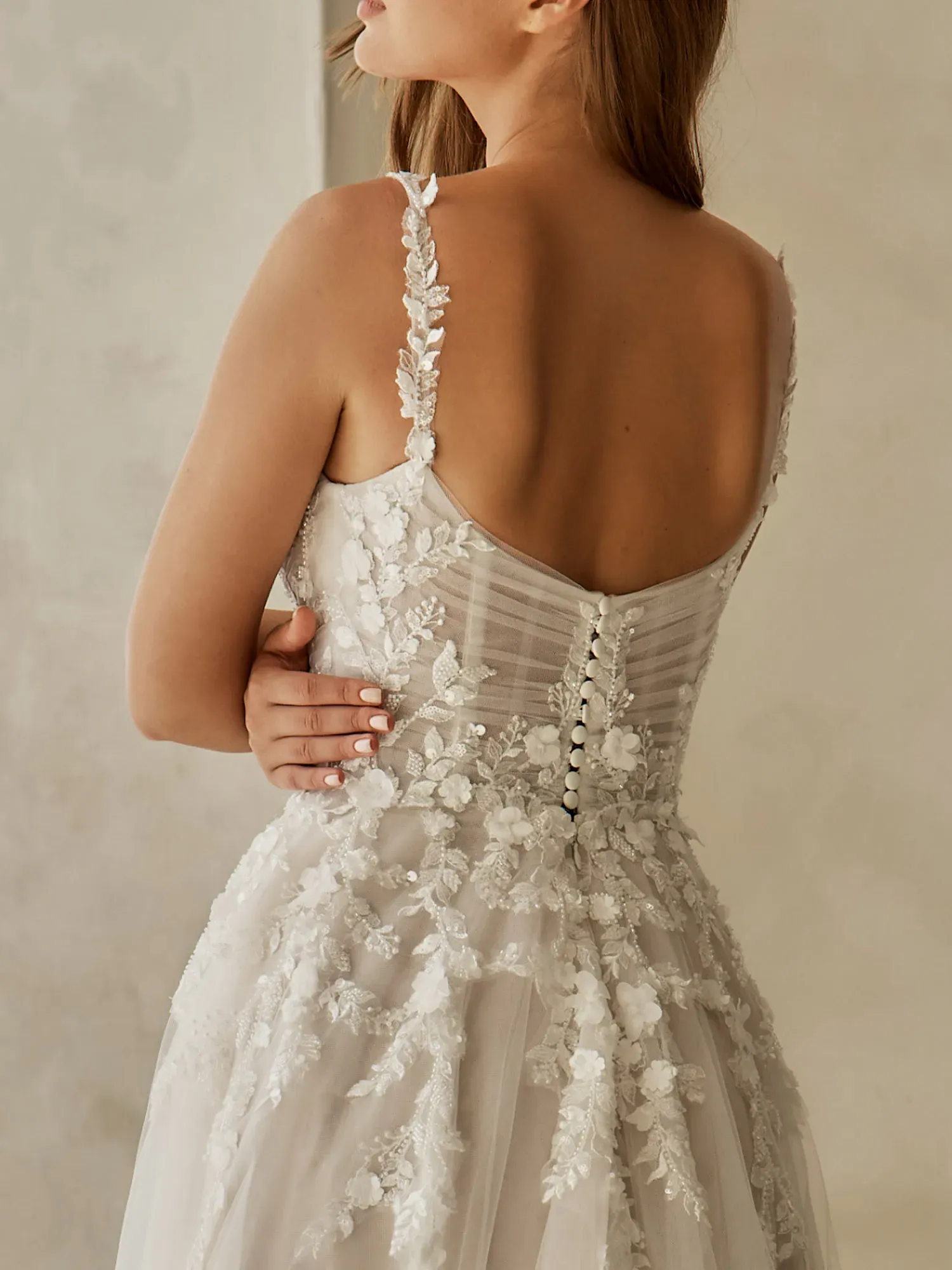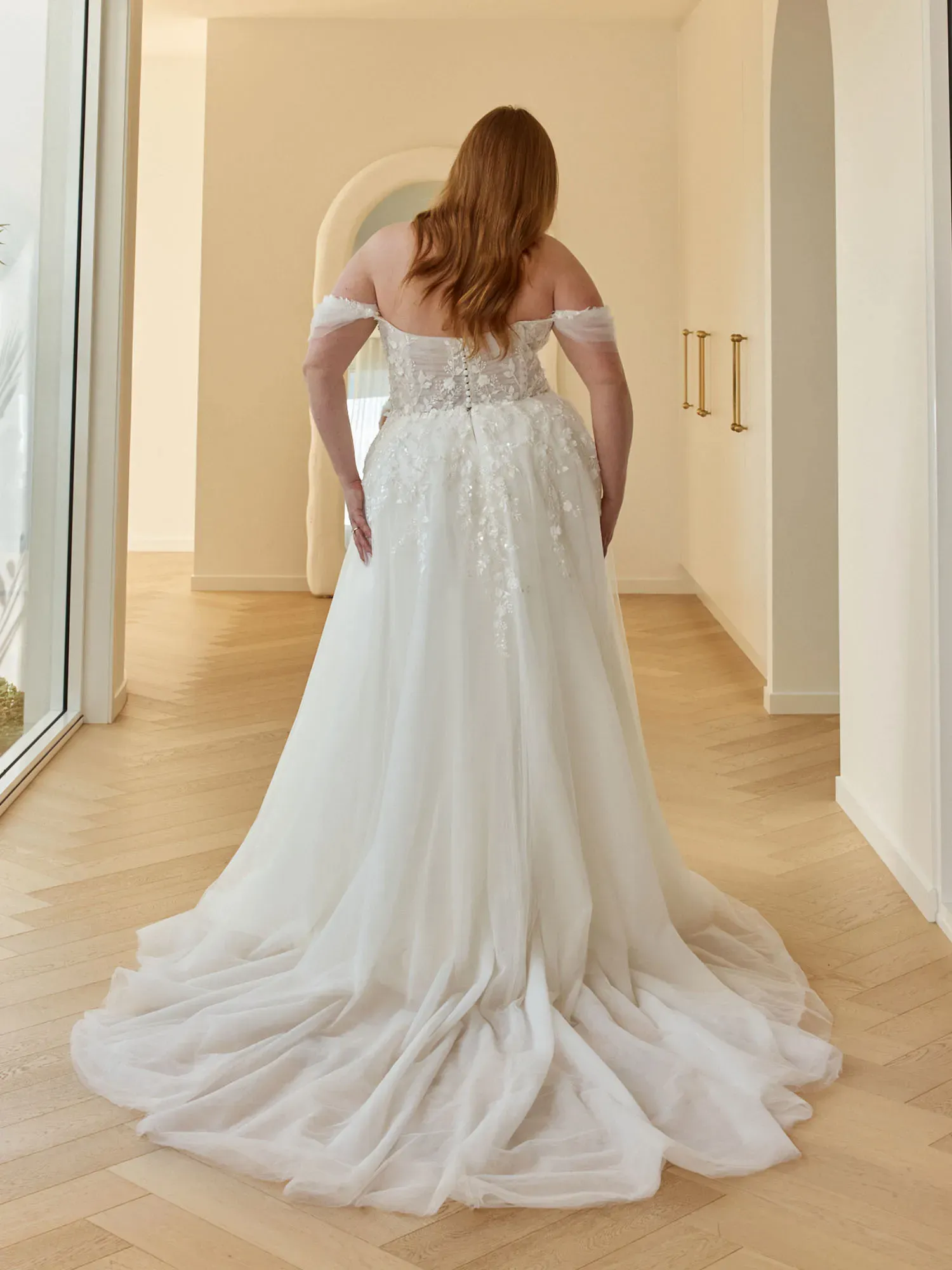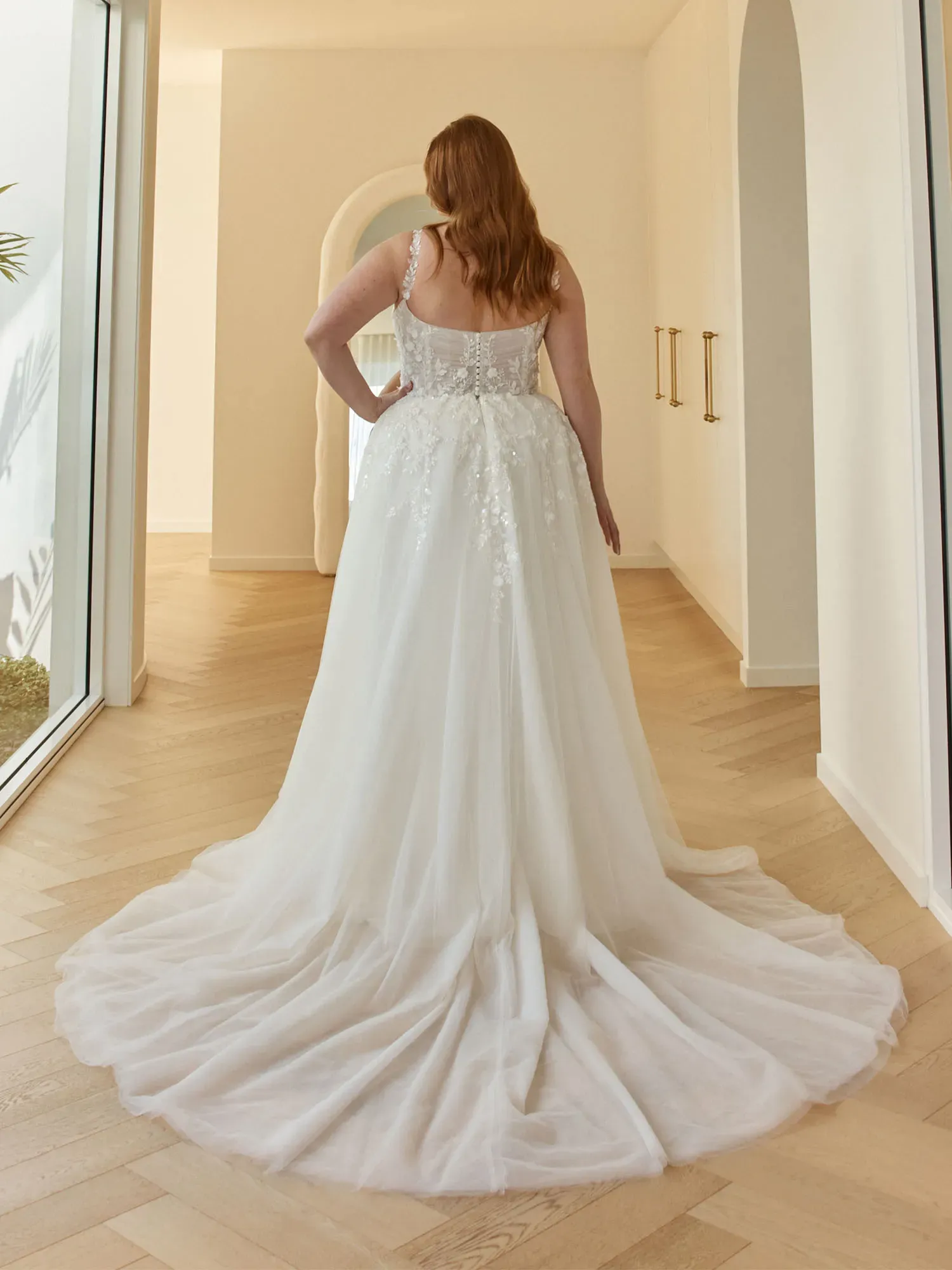 - Finished with a shorter plain-hem train for an effortlessly delicate, airy look