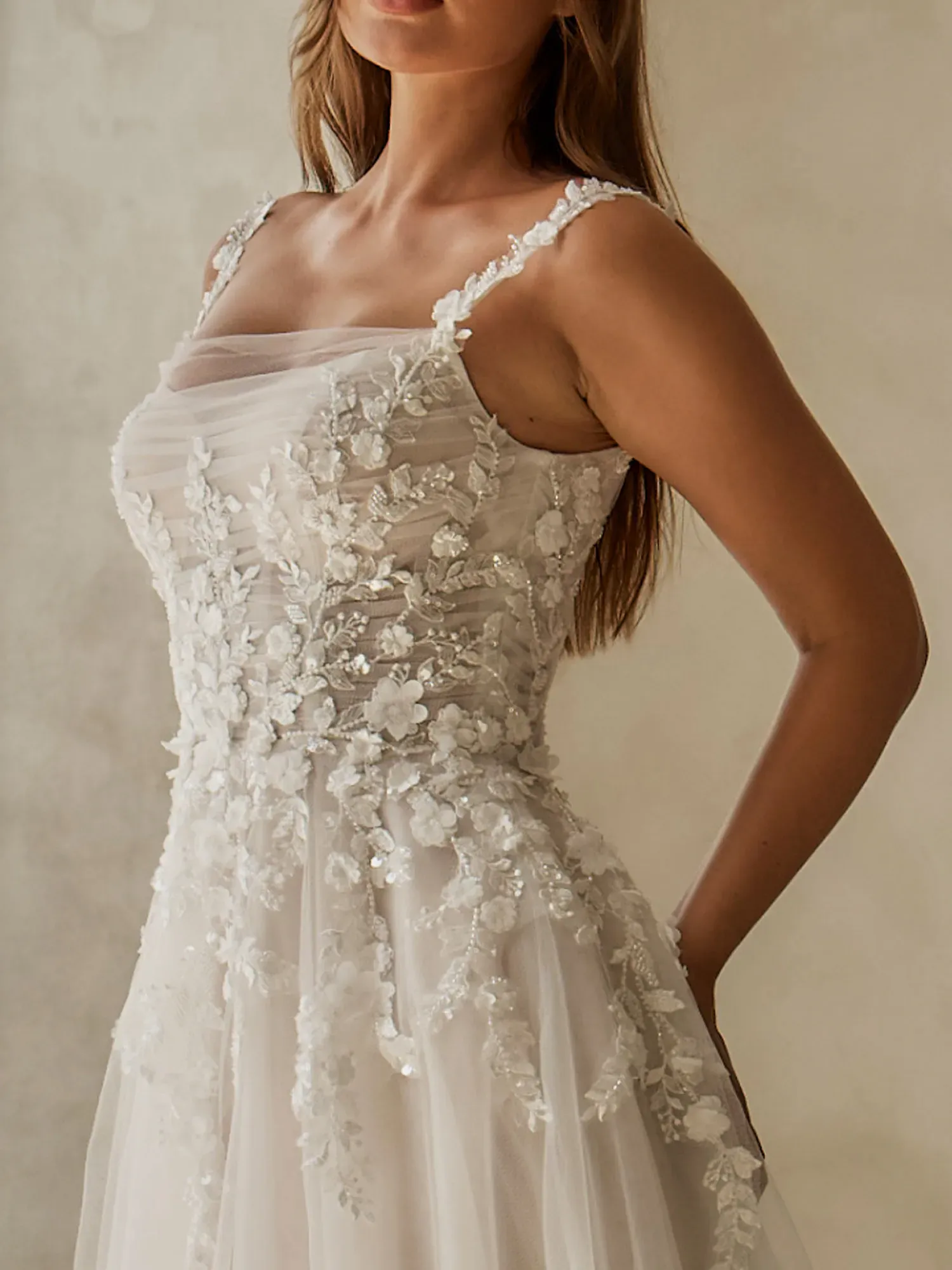 - Modest scoop neckline with gathered sheer tulle and motif-embellished straps, plus optional off-shoulder tulle straps