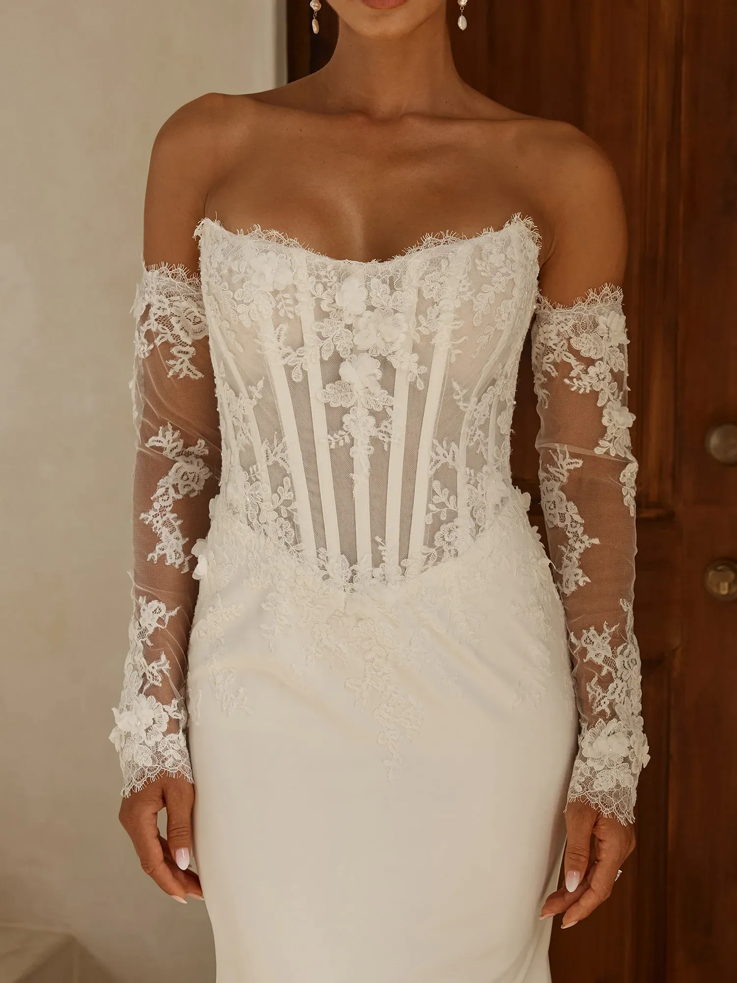 - Optional off-shoulder lace sleeves with scalloped edging for a refined second look