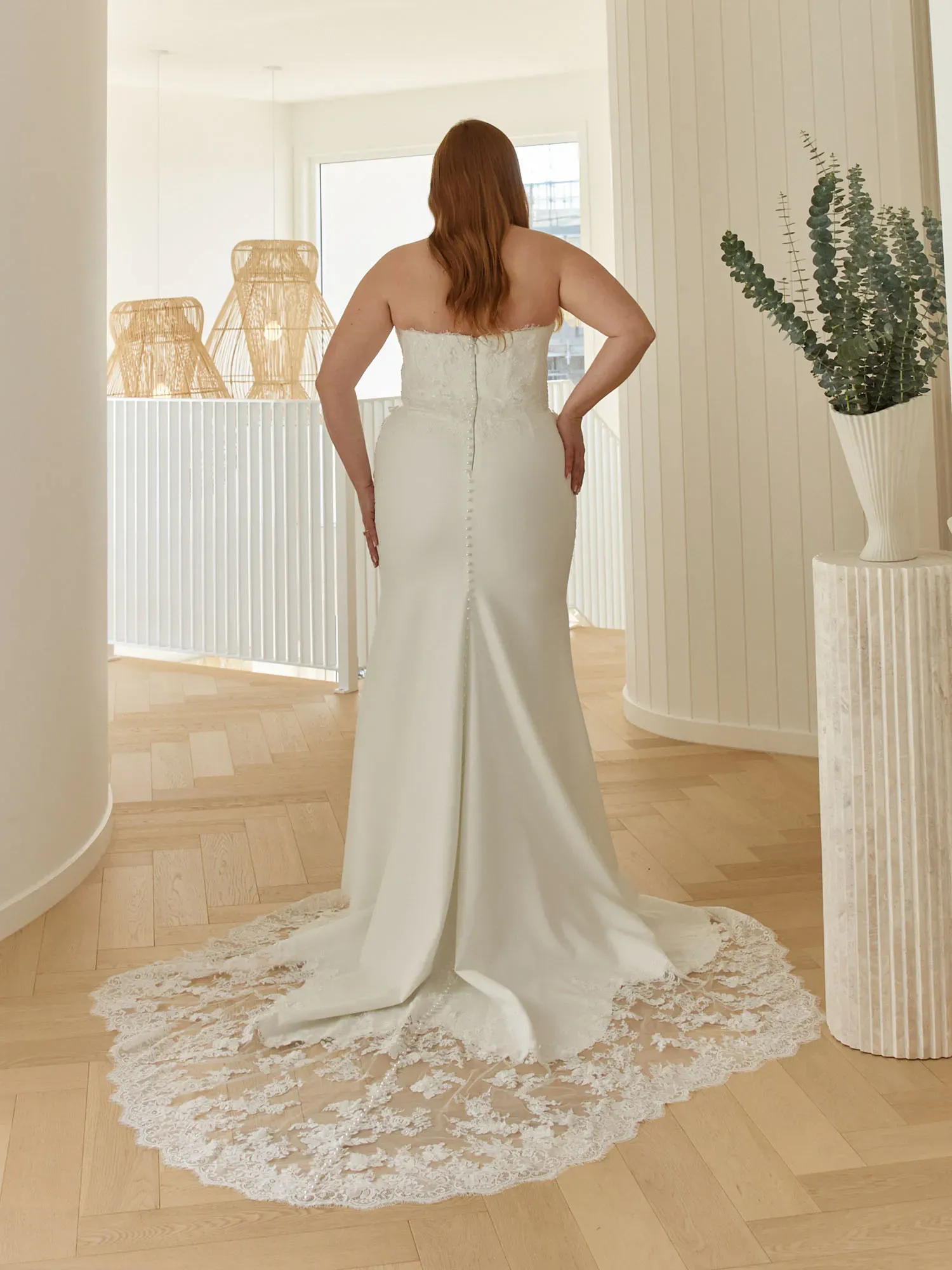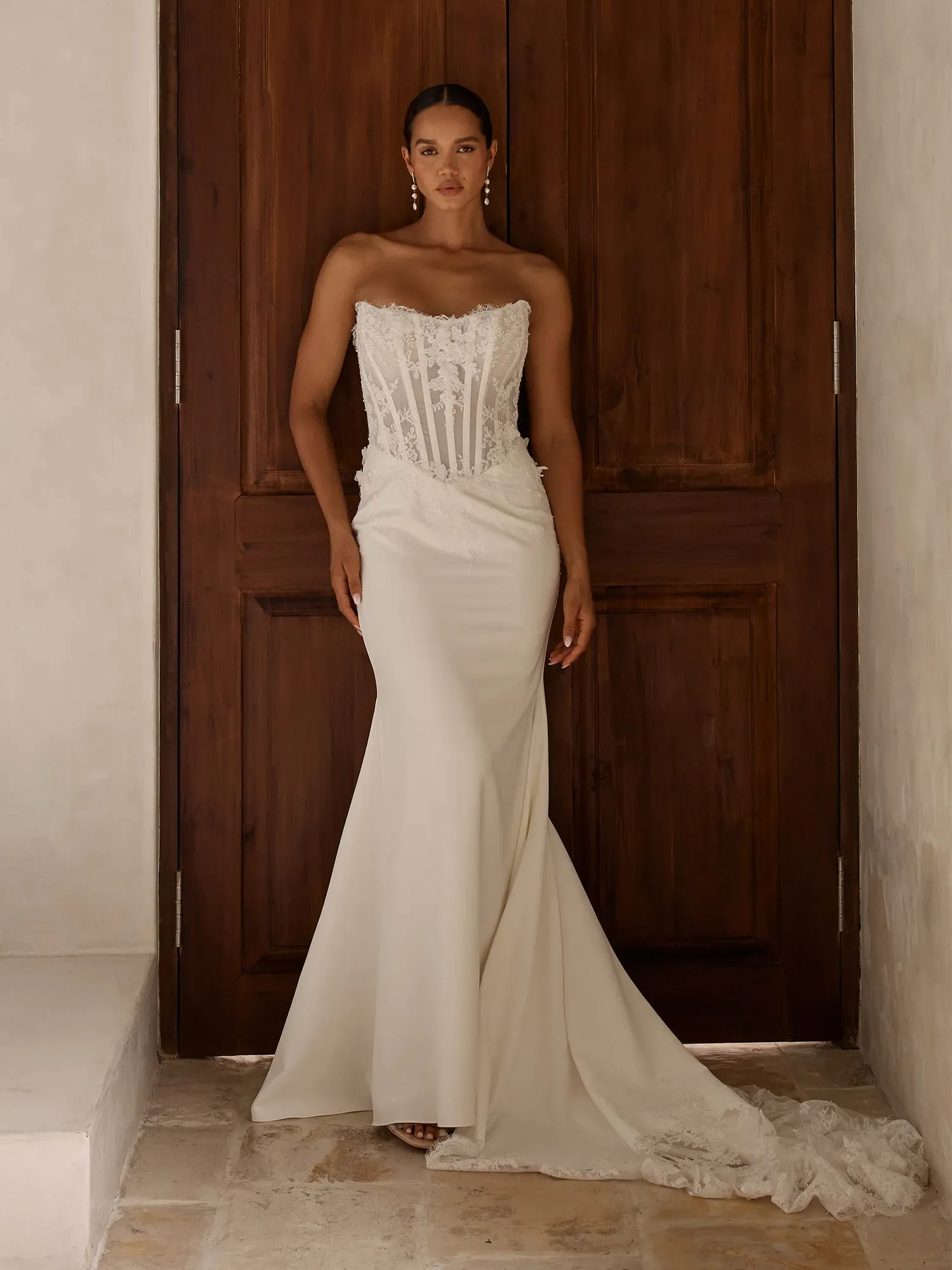 Modern, sculpted, and softly romantic, Lohan by Serene Bridal is designed for the bride who loves clean crepe structure enhanced with timeless floral lace. She balances contemporary elegance with subtle sensuality through delicate, thoughtful detailing.