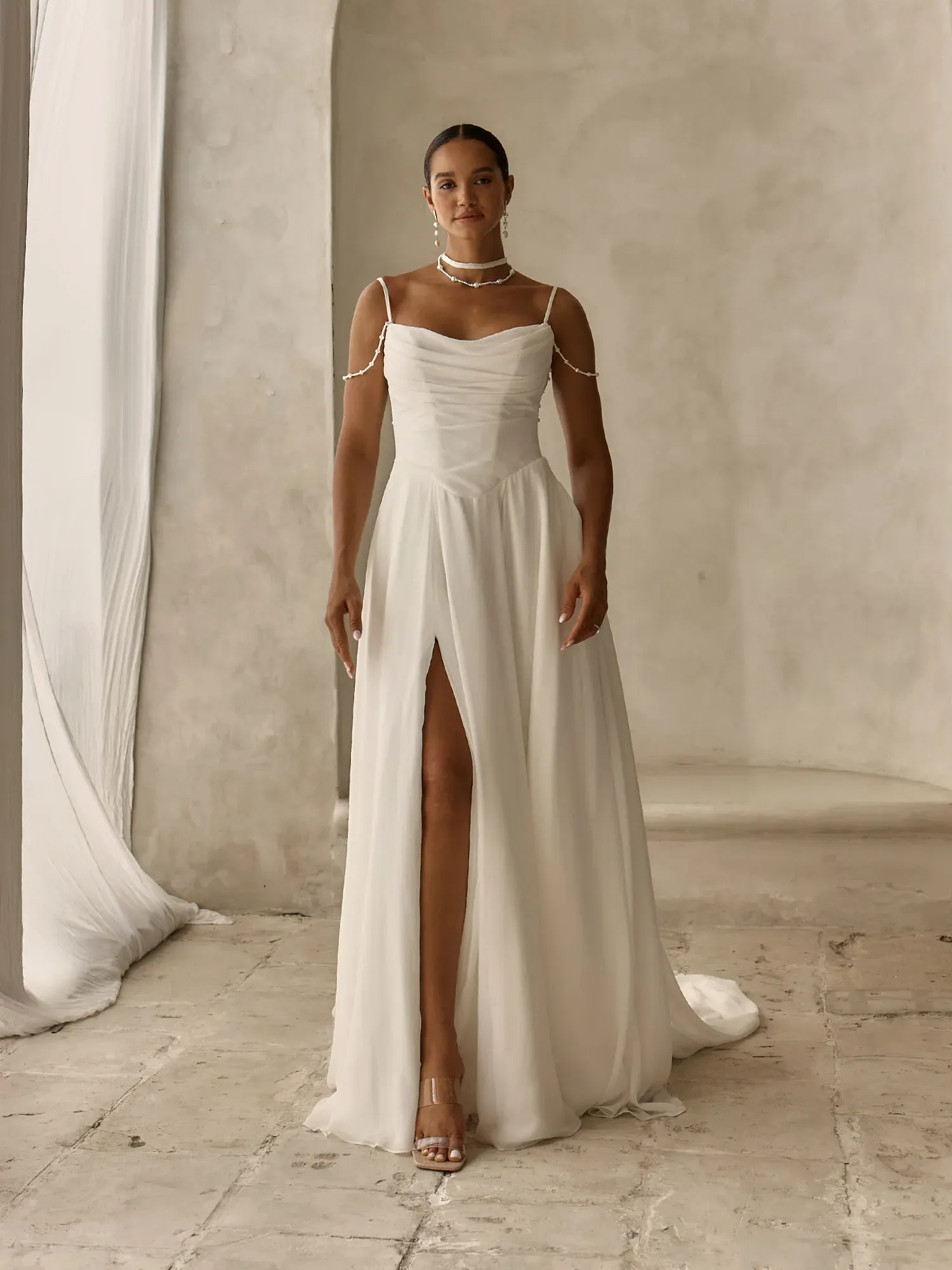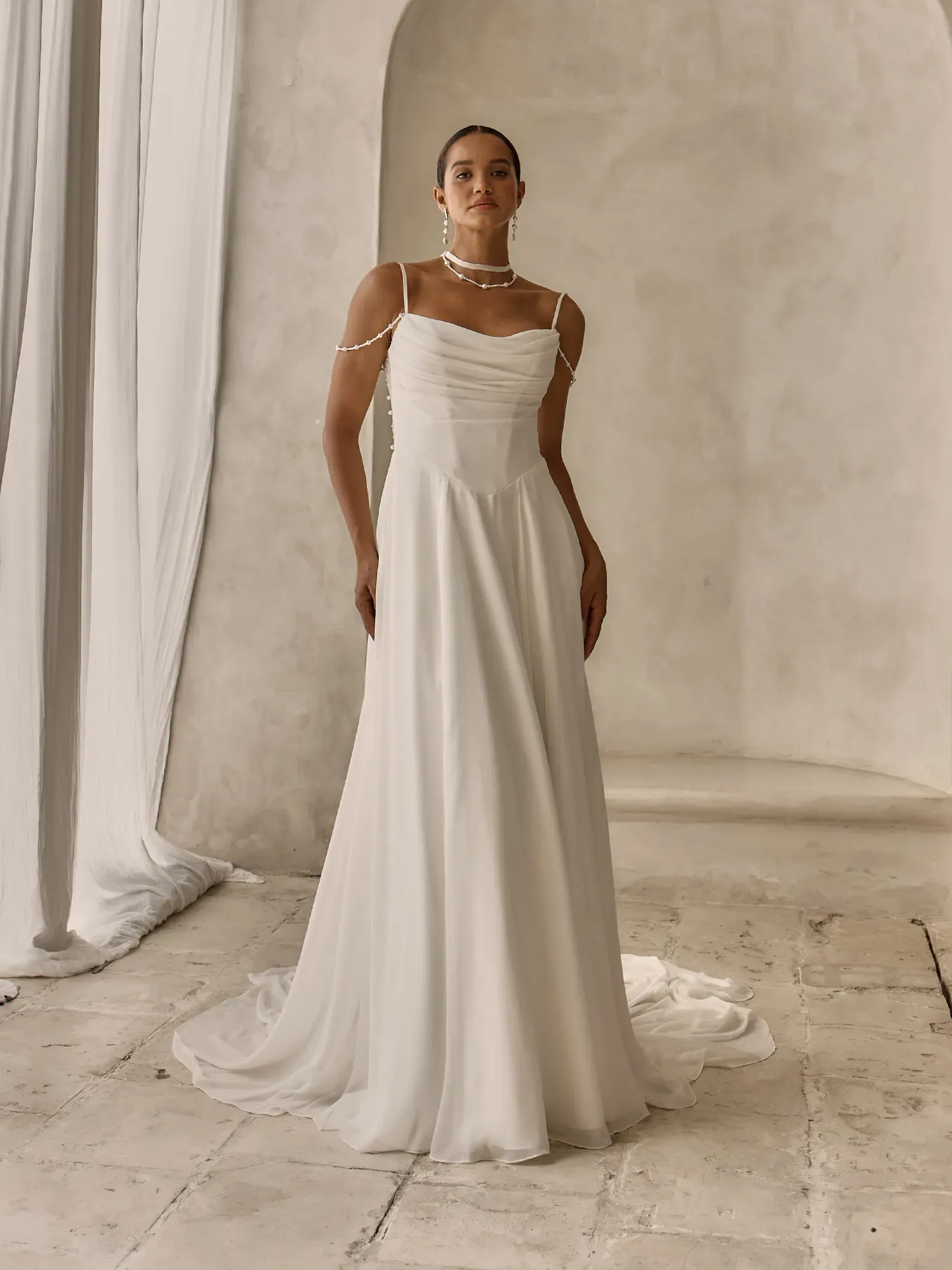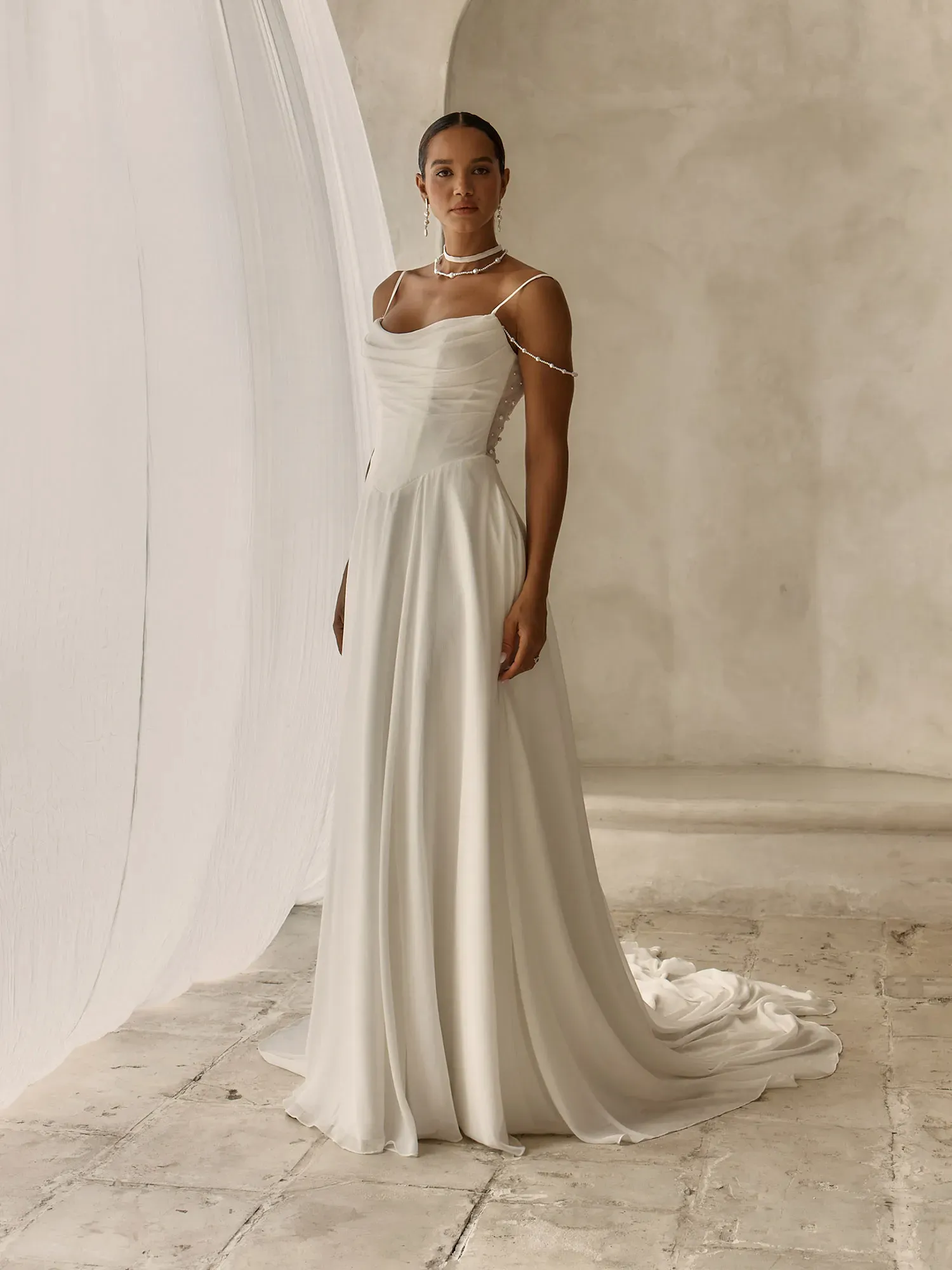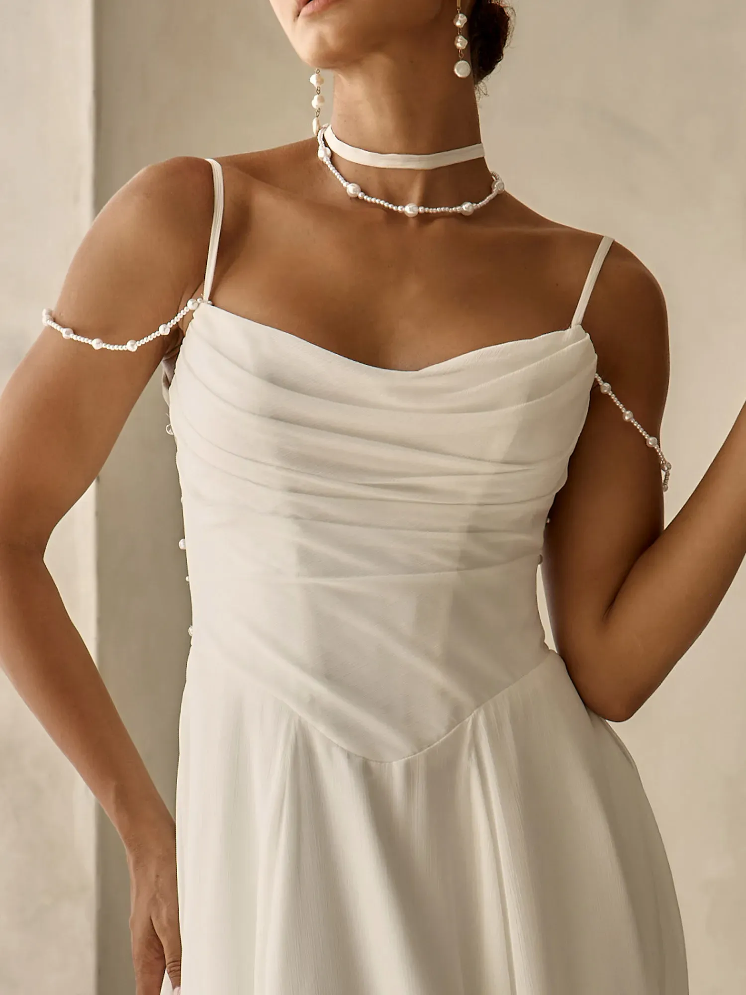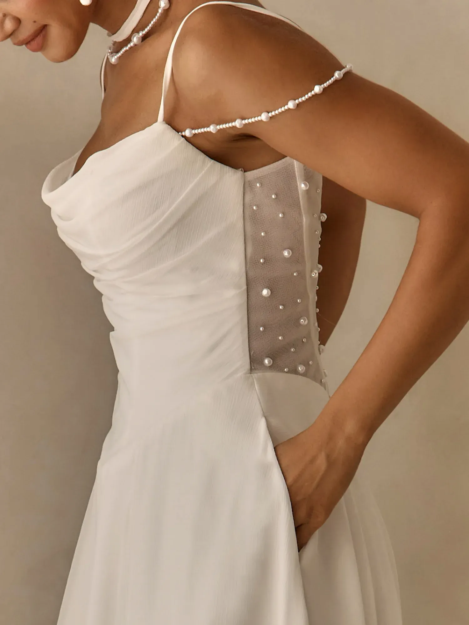 - Scoop neckline bodice with chiffon straps and draped off-shoulder pearl-beaded strands
