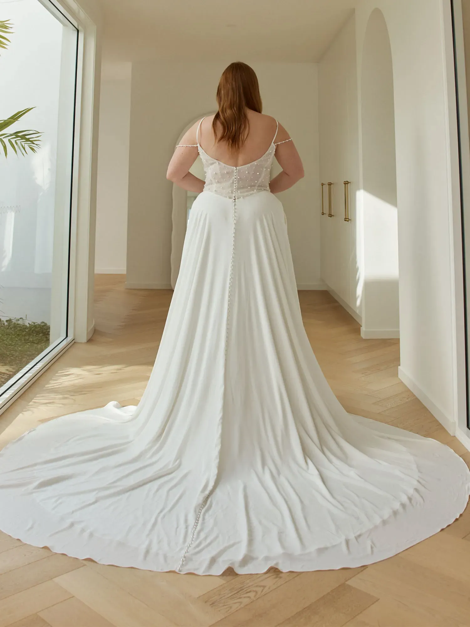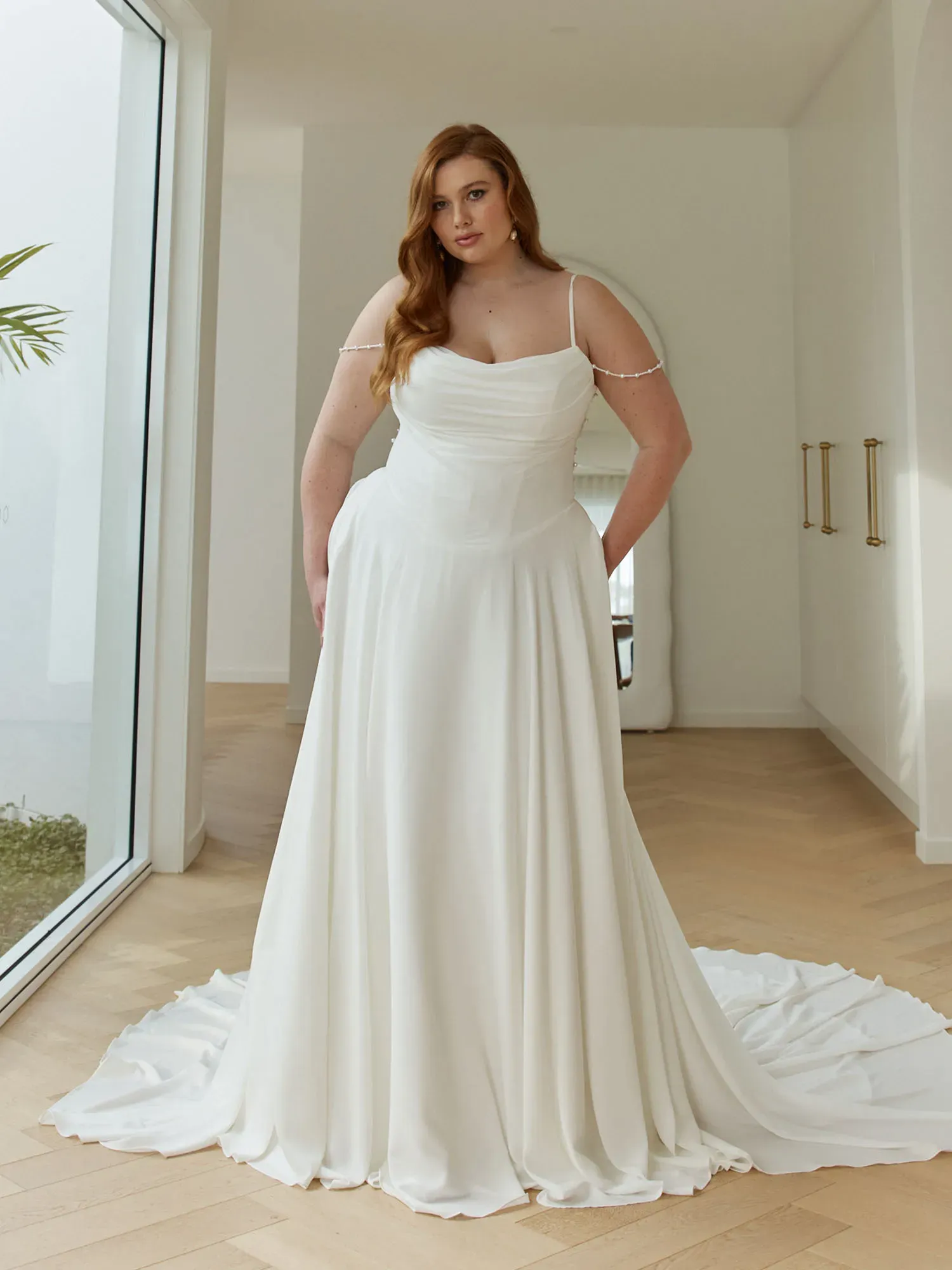Chic, modern, and delicately embellished, Rink by Serene Bridal is designed for the bride who loves a clean chiffon silhouette accented with elegant pearl details. Soft structure and subtle texture create a polished, effortlessly wearable look.