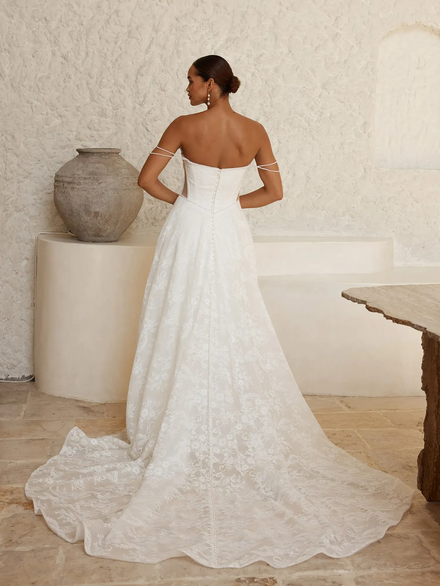 - Finished with a row of pearl buttons cascading from the back bodice to the hem of the train