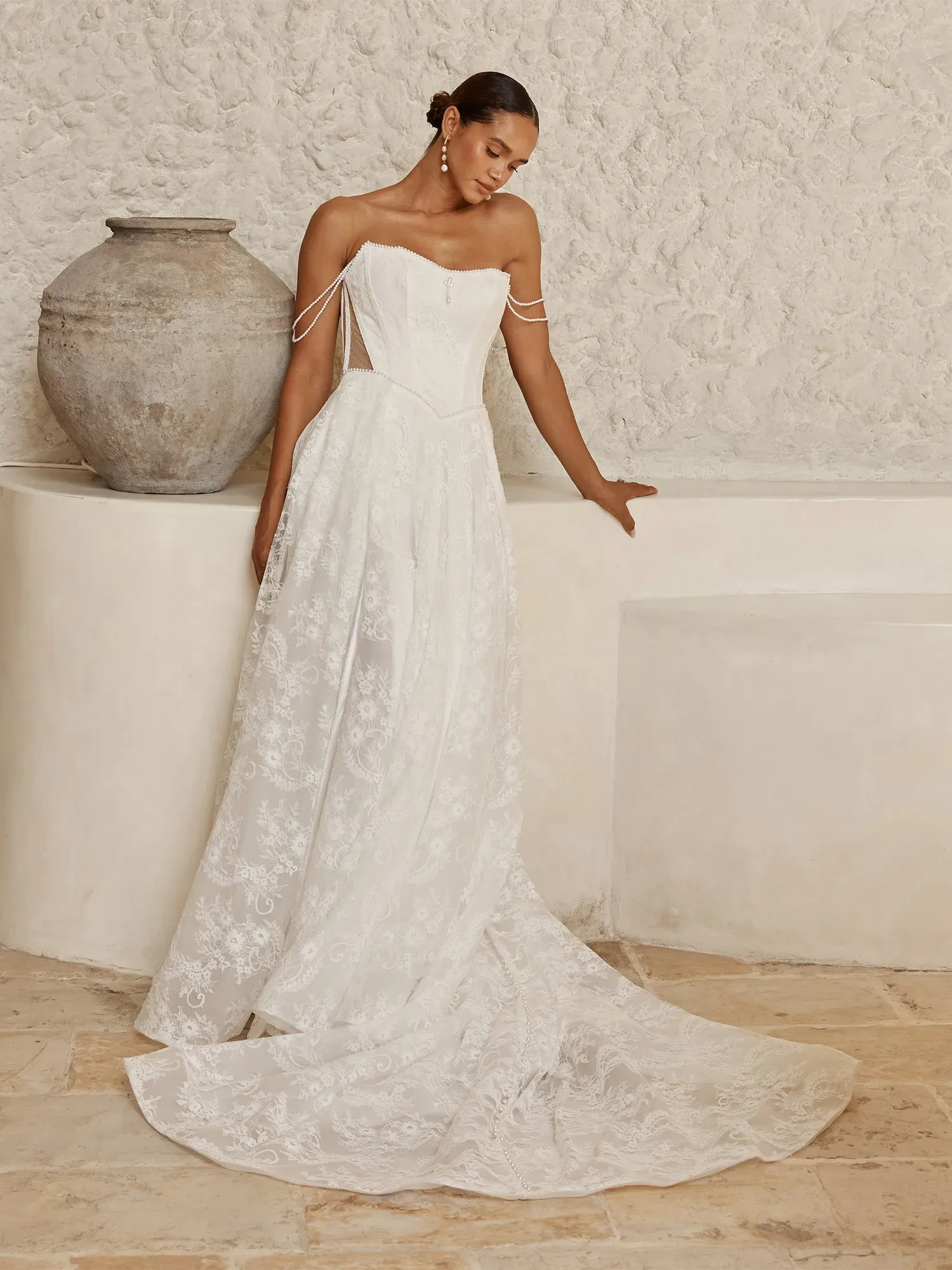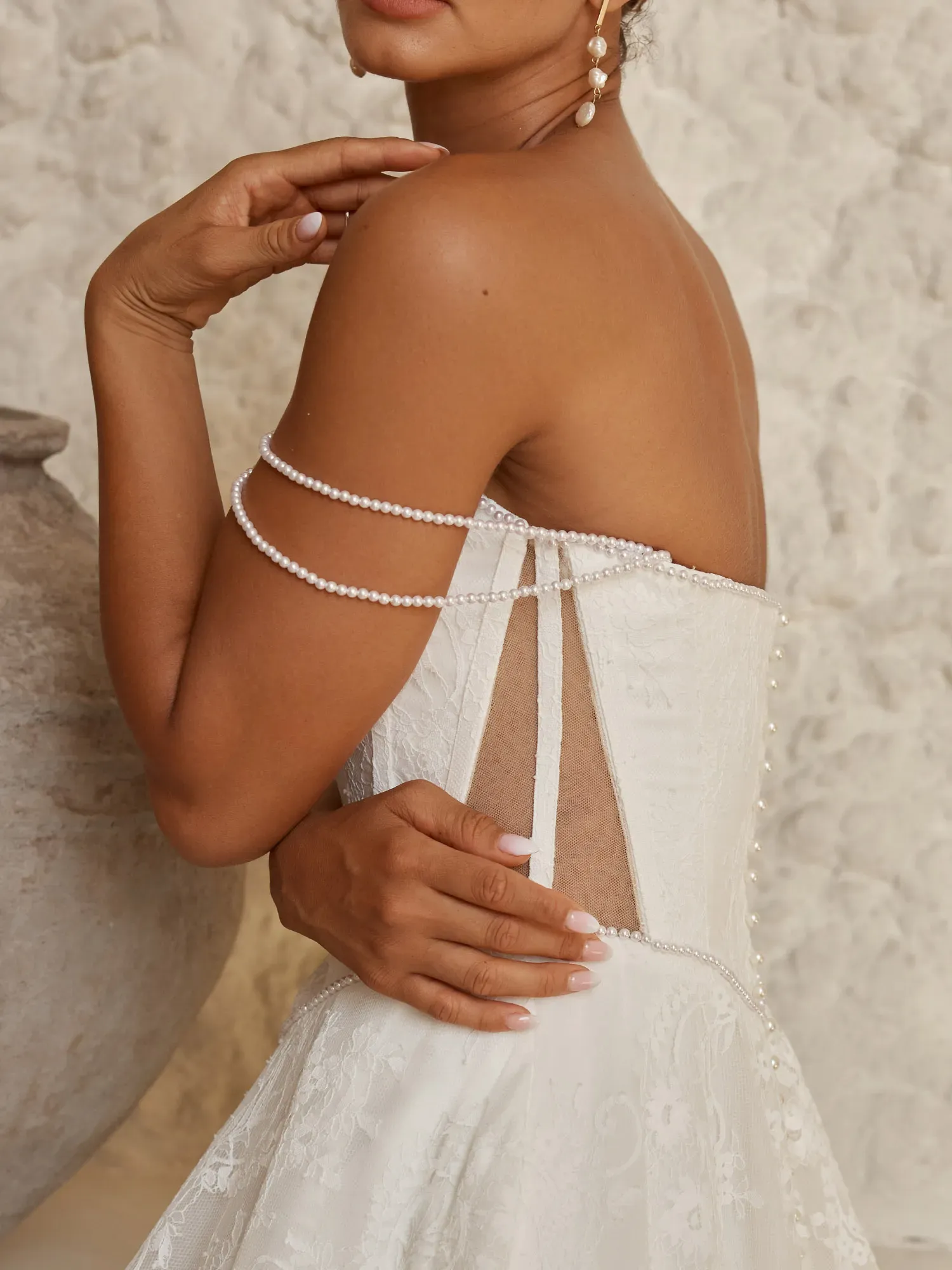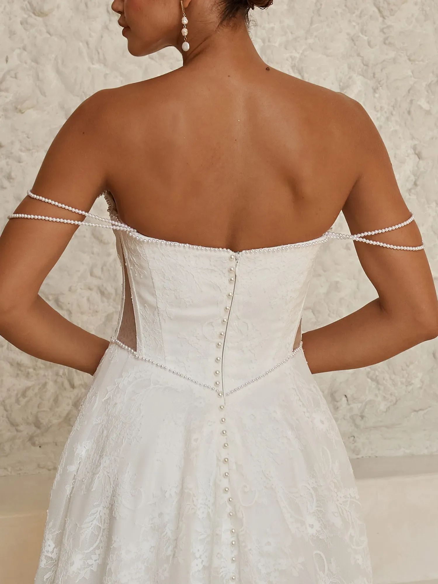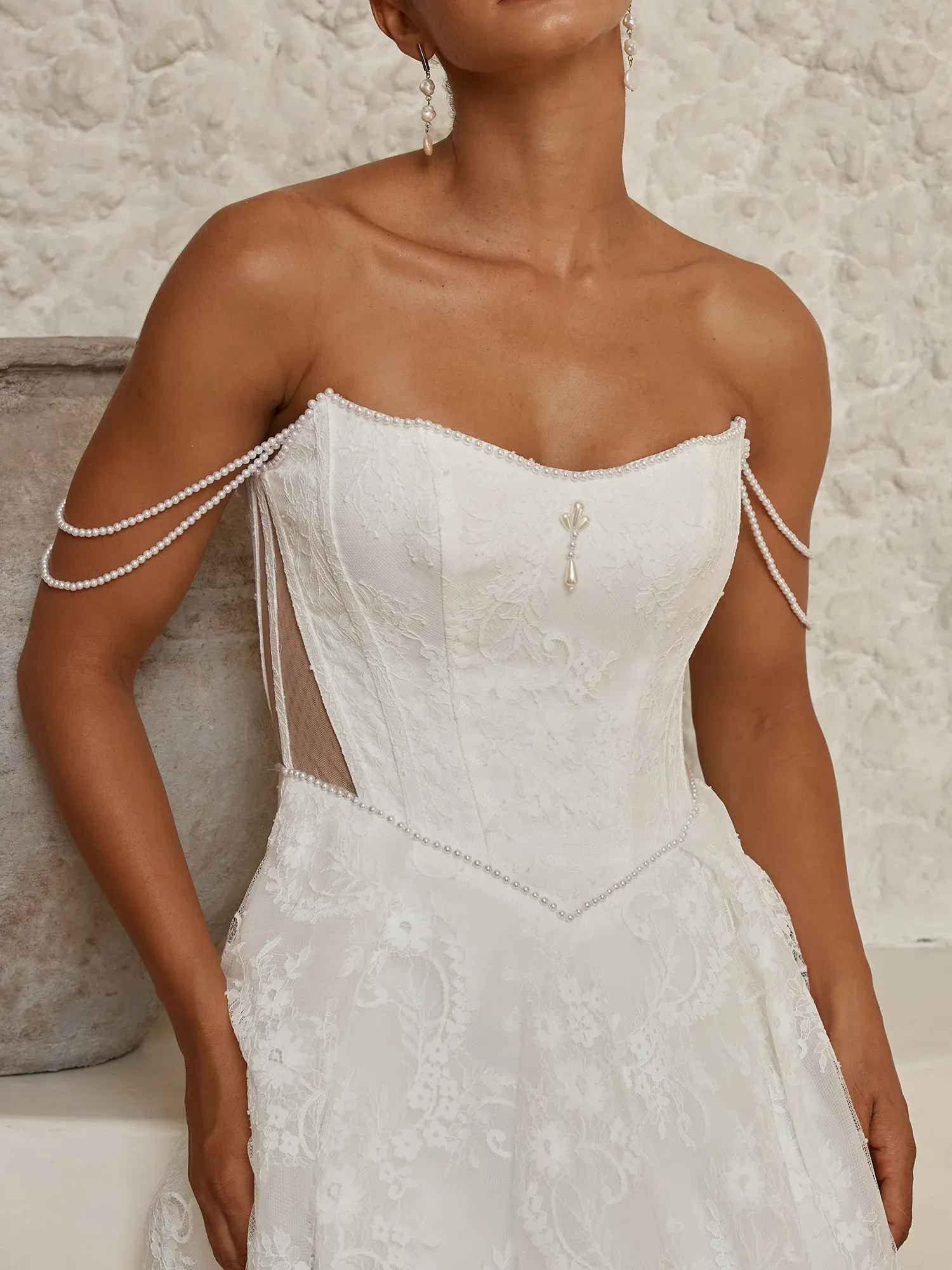- Scoop neckline with subtle peaked shaping and detachable off-shoulder pearl-beaded straps