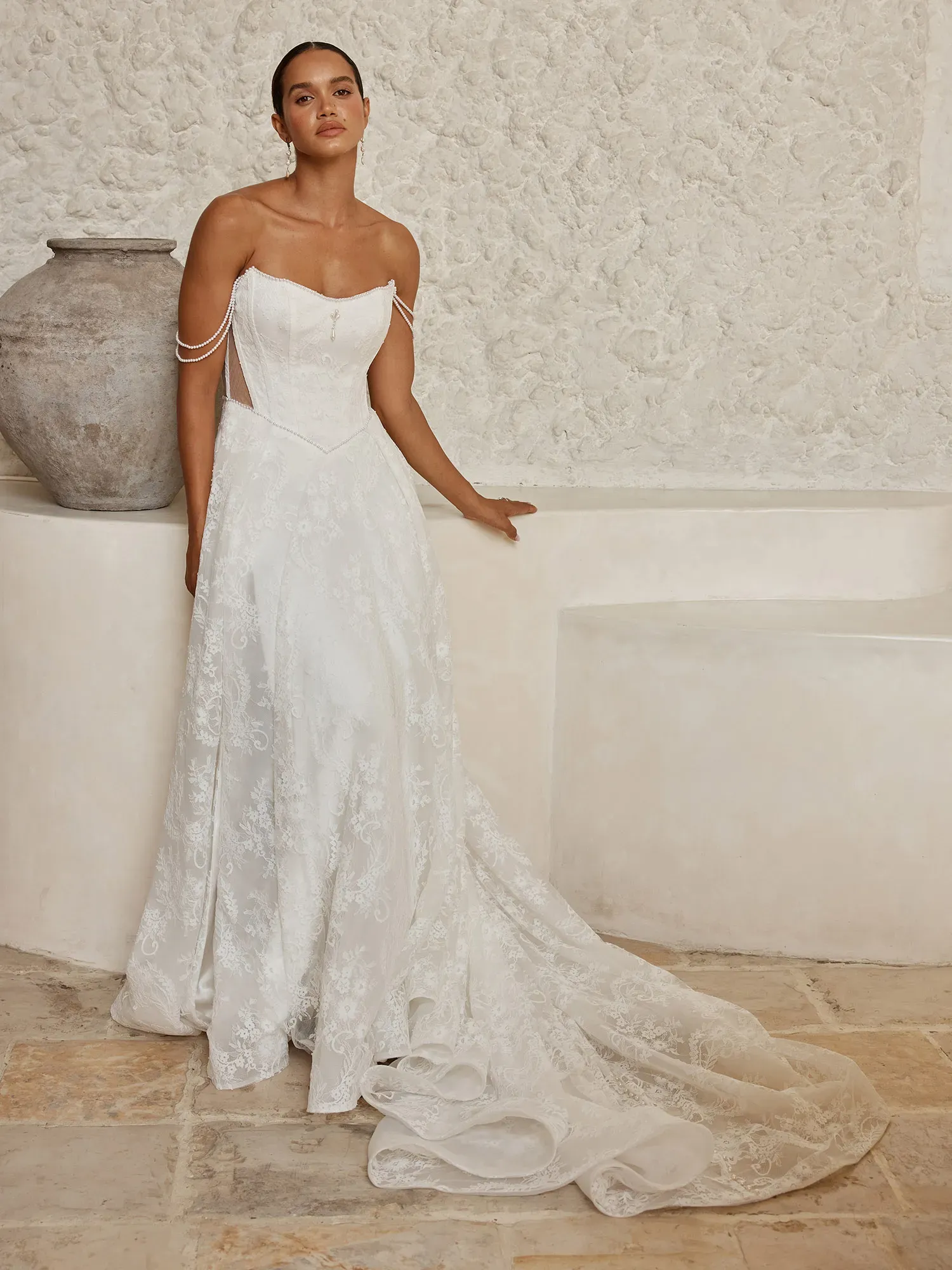 Vintage-inspired and richly romantic, Vaughn by Serene Bridal is designed for the bride who loves classic Chantilly lace enhanced with pearl-accented elegance. Soft structure and delicate embellishment create a refined, feminine silhouette.